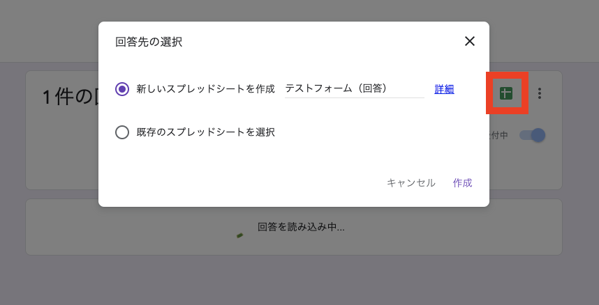 定期的なアンケートやプロジェクト管理などで1つのスプレッドシートに複数のタブ分けして追加したい場合は、「既存のスプレッドシートを選択」を選択して作成します。