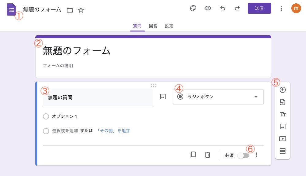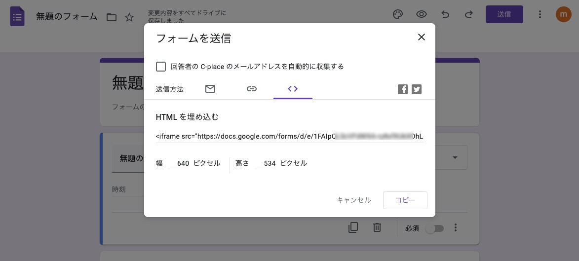 フォーム作成が完了したら画面右上の「送信」をクリックしてリンクの発行やフォームの埋め込みを行います。