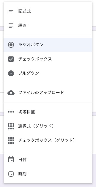「記述式」や「ラジオボタン」といった入力形式を選択します。
